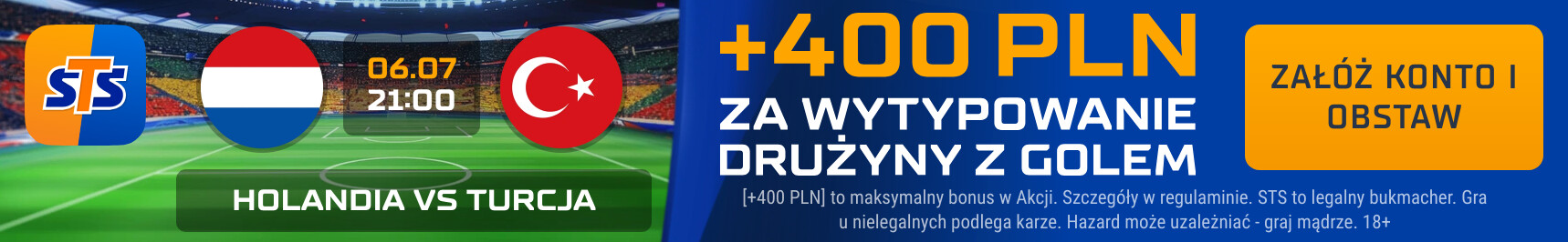 Gdy po zarejestrowaniu się w STS z kodem GOL400 wytypujemy poprawnie gola Holandii w meczu z Turcją to poza standardową wygraną dodatkowo zgarniamy bonus w wysokości 400 zł. Wystarczy postawić 2 zł, zatem kurs przy takiej stawce to 200.0!